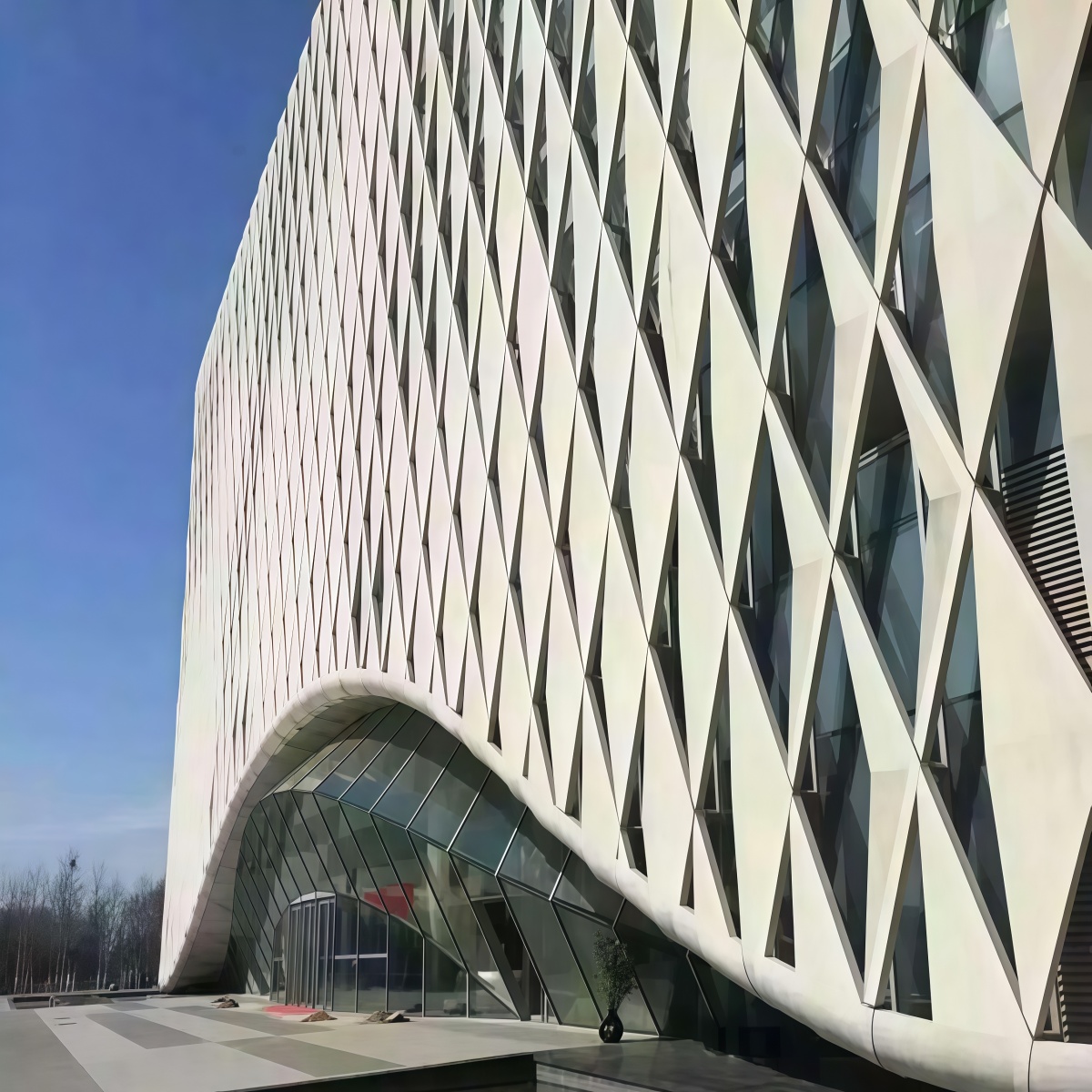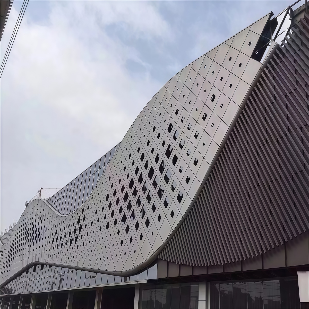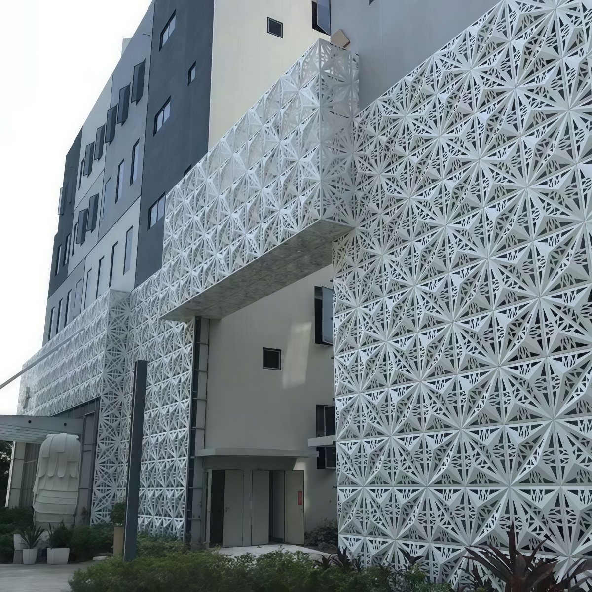 Double-curved panels are aluminum sheets formed into two-direction curvature, which allows architects to create elegant “wave”, “dome”, or “free-form” facade surfaces. Compared with flat panels, double-curved designs can achieve stronger visual impact, better continuity, and a premium architectural identity.