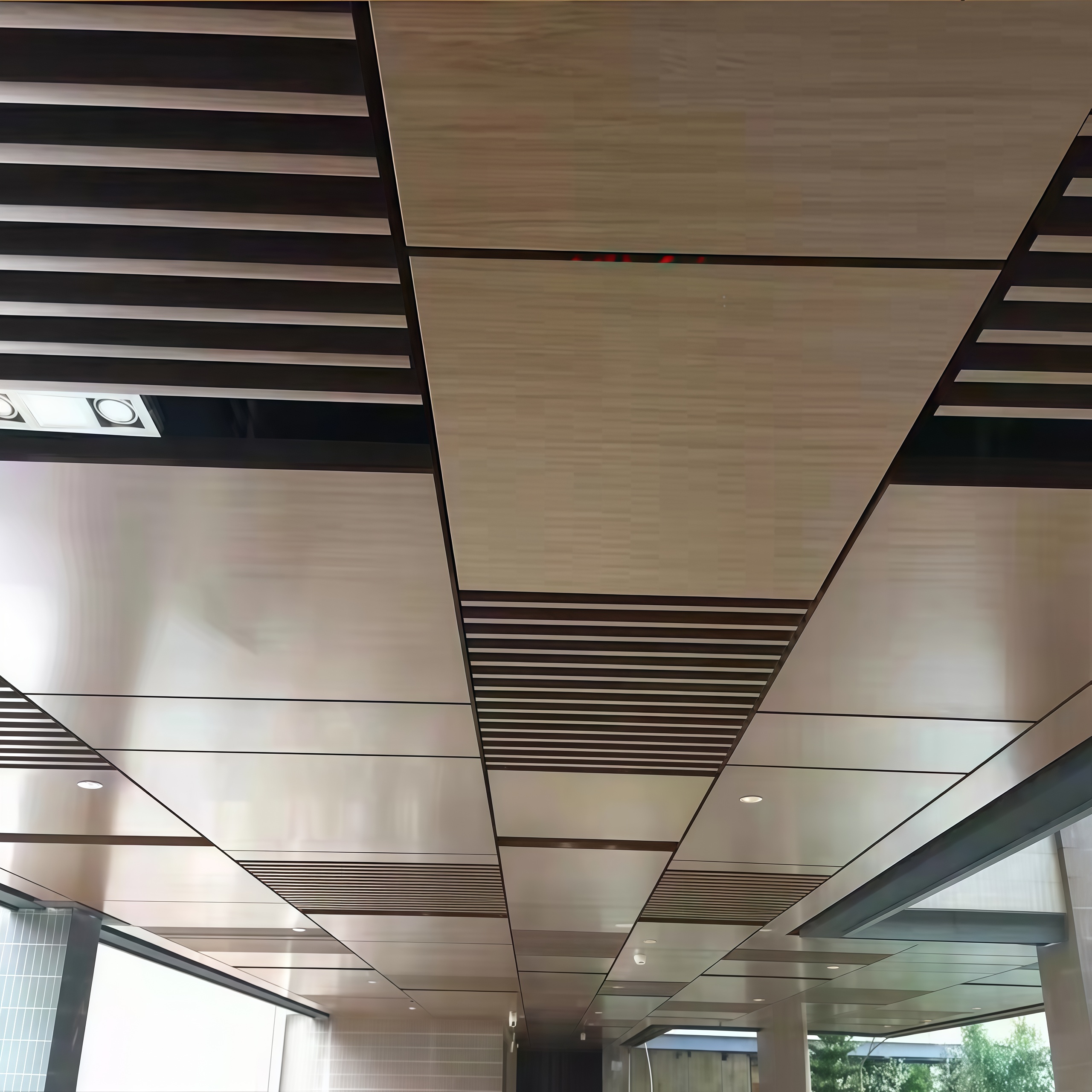 Wood-grain aluminum panels combine a warm timber look with clean metallic lines. They support large-area layouts, strip patterns, and modular designs, with seamless integration of concealed lighting, downlights, and access panels for a refined ceiling finish.